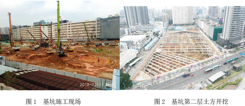 該項(xiàng)目位于深圳市福田區(qū),場(chǎng)地南臨八卦三路,西鄰上步北路,北臨泥崗西路。場(chǎng)地南側(cè)為已施工的地鐵七號(hào)線八卦嶺站,八卦嶺站的站廳層伸入本項(xiàng)目紅線5.8m,支護(hù)樁距離站廳層邊界凈距3m,西側(cè)為規(guī)劃的地鐵六號(hào)線區(qū)間隧道,東北側(cè)為國(guó)安居建材市場(chǎng)。本項(xiàng)目共五層地下室,分為一期、二期開發(fā)。一期基坑支護(hù)設(shè)計(jì)周長(zhǎng)為625.01m,基坑面積為22803.65㎡,基坑周邊地面標(biāo)高為絕對(duì)標(biāo)高22.31~24.83m,基坑深24.71~27.23m?;硬捎萌冷摻罨炷羶?nèi)支撐+地下連續(xù)墻支護(hù),基坑深度約22米,基坑周長(zhǎng)約510m。深勘集團(tuán)承擔(dān)本項(xiàng)目的監(jiān)測(cè)工作。